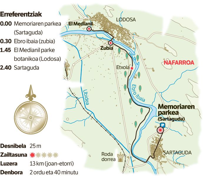 Memorian barnako ibilaldia bi kilometro ingurukoa da. Parkean bertan hasi eta herriko hilerriraino iristen den bide interesgarria osa daiteke. 2008an inauguratutako parkean sartu, eta Nafarroan memoriaren defentsarako eraiki den monumenturik esanguratsuena bisitatu daiteke bertan. Parketik irtenda, Ortutxo izena hartu duen parke berriaren ondotik igaro, eta Sartagudan sartzen den kale nagusiari men egingo zaio. Herriko zoko-mokoak ezagutzeko eta iragana berreraikitzeko gonbita egiten dute gune estrategikoetan jarritako argibide taulek. Herriko pilotalekura iritsita, kalean aurrera segitu, eta, kultur etxearen paretik igarota, aukera izango da Erriberaren gaineko talaia batera hurbiltzeko. Balkoi interesgarria da Ebro ibaiaren ondoan hazten diren arboladia eta baratze alorrak ikusteko, baita XIII. mendera eramango duen Radako dorretxea ere, zeina muino xume baten gainean altxatzen den, Lodosako barrutian.